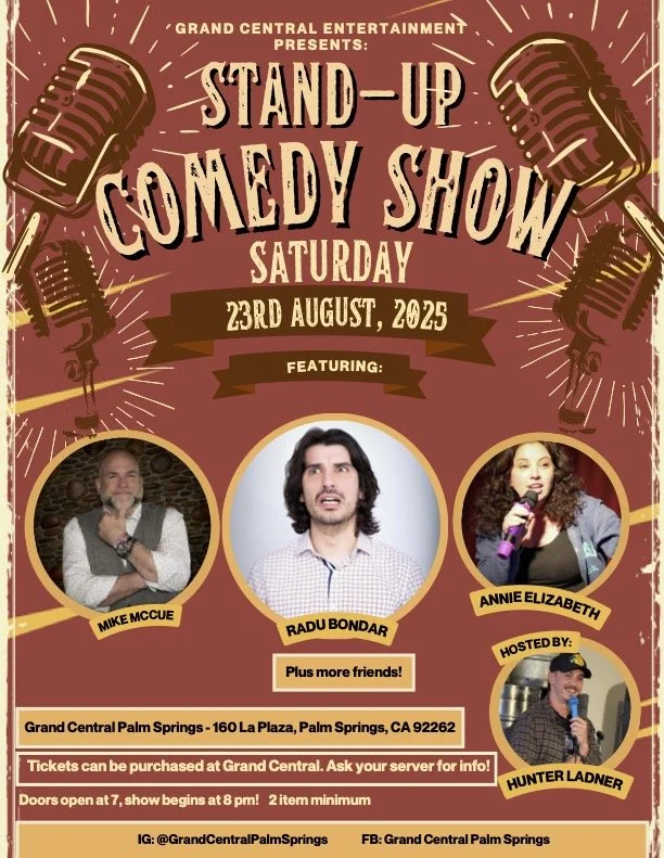 Comedy ShowSaturday, August 25, 20257:00 pm Doors open8:00 pm Show startsCall restaurant for more information 760.699.7185
